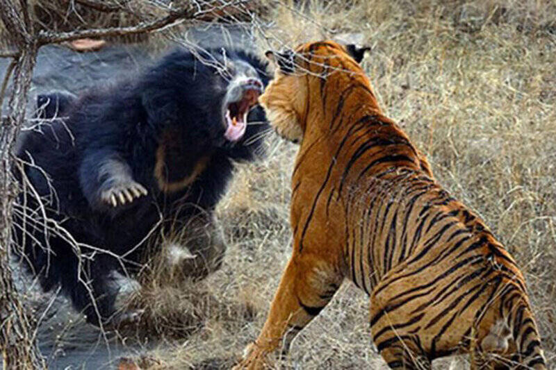 در ابتدای این ویدئو در حالی که خرس سیاه در مقابل درخت ایستاده و در جستجوی غذا است یک ببر آرام آرام و از پشت سر به آن نزدیک میشود. لحظاتی بعد ببر پس از رسیدن به خرس ناگهان به هوا پریده و به آن حمله ور میشود، اما در همین لحظه خرس به عقب برگشته و با ایستادن روی پای خود در مقابل ببر قرار میگیرد. ببر که با دیدن خرس خشمگین جانش را در خطر میبیند فرار را ترجیح داده و سریع از مقابل خرس دور میشود. خرس نیز برای مسافتی کوتاه ببر را تعقیب میکند. این ویدئو پس از انتشار تاکنون بیش از ۱۵ هزار بار دیده شده است. انتشار این ویدئو با واکنش کاربران نیز همراه بود. یکی از کاربران در کامنتی نوشت: موقعیت خطرناک برای شوخی کنندگان. کاربر دیگری با تعجب پرسید: چرا خرس زودتر متوجه خطری که در کمین او بود نشد؟
