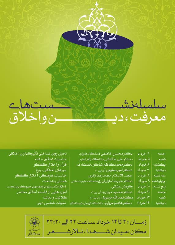 به گزارش سرویس استان های حلقه وصل، سلسله نشستهای «معرفت، دین و اخلاق» با هدف ارتقاء فهم عمومی طلاب، دانشجویان و شهروندان علاقهمند نسبت به مسائل فکری، در حوزههای مانند فلسفه اخلاق، روانشناسی اخلاق، اخلاق شهروندی، فلسفه دین و ایجاد بسترسازی برای ترویج گفتمان اخلاقی در مشهدالرضا(ع) از چهارم تا چهاردهم خردادماه در تالار شهر برگزار می گردد.