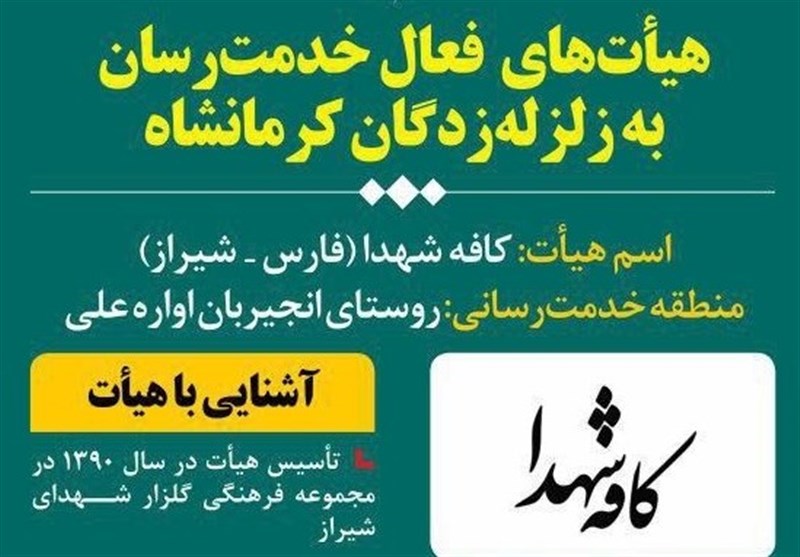 با توجه به اینکه چندین سال هیئت کافه شهدای شیراز با اجرای برنامههای مختلف سعی در خدمترسانی به مردم داشته، در روزهای ابتدایی وقوع زلزله کرمانشاه اعضای هیئت تصمیم گرفتند برای کمک و روحیهبخشی به مردم زلزله زده گام بردارند. اعتقاد بچههای هیئتی شهر شیراز این نبود که اقداماتی را به اسم اعضاء و مجموعه کافه شهدا تمام کنند، بلکه هدف تنها خدمترسانی به مردم بوده است.