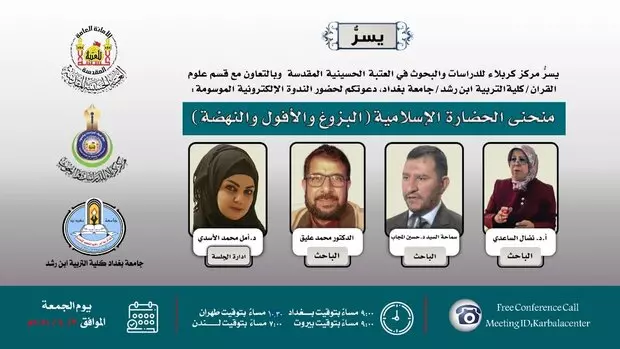 به گزارش حلقه وصل؛ نخستین وبینار تمدن نوین اسلامی در خارج از ایران، از سوی مرکز مطالعات و پژوهش های آستان مقدس امام حسین ع و دانشکده ابن رشد دانشگاه بغداد با عنوان سیر تمدن اسلامی؛ از ظهور تا افول و دوران نهضت نوین و سخنرانی سه تن از استادان عرب برگزار شد.