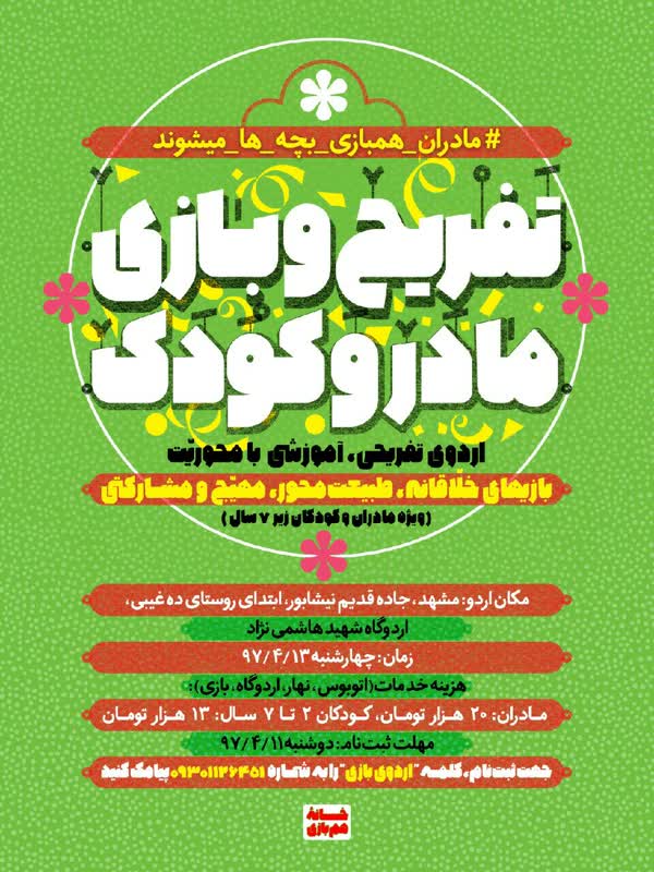 سلطانی خاطر نشان کرد: این اردوی یک روزه چهارشنبه 13 تیرماه با محوریت بازیهای خلاقانه، طبیعت محور، مهیج و مشارکتی ویژه مادران و کودکان زیر 7 سال برگزار می گردد.