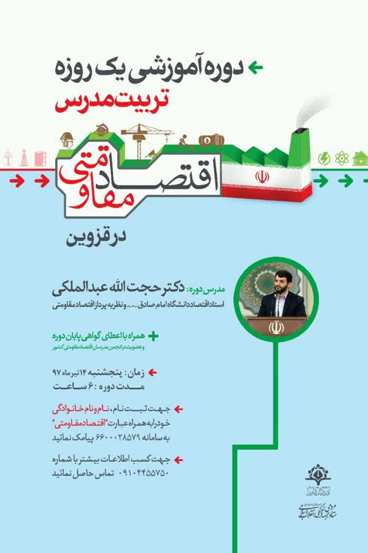 عبادی تصریح کرد: این نخستین دوره تربیت مدرس اقتصاد مقاومتی است که پنجشنبه 14 تیرماه با حضور دکتر عبدالملکی طی یک جلسه ی شش ساعته برگزار می شود.