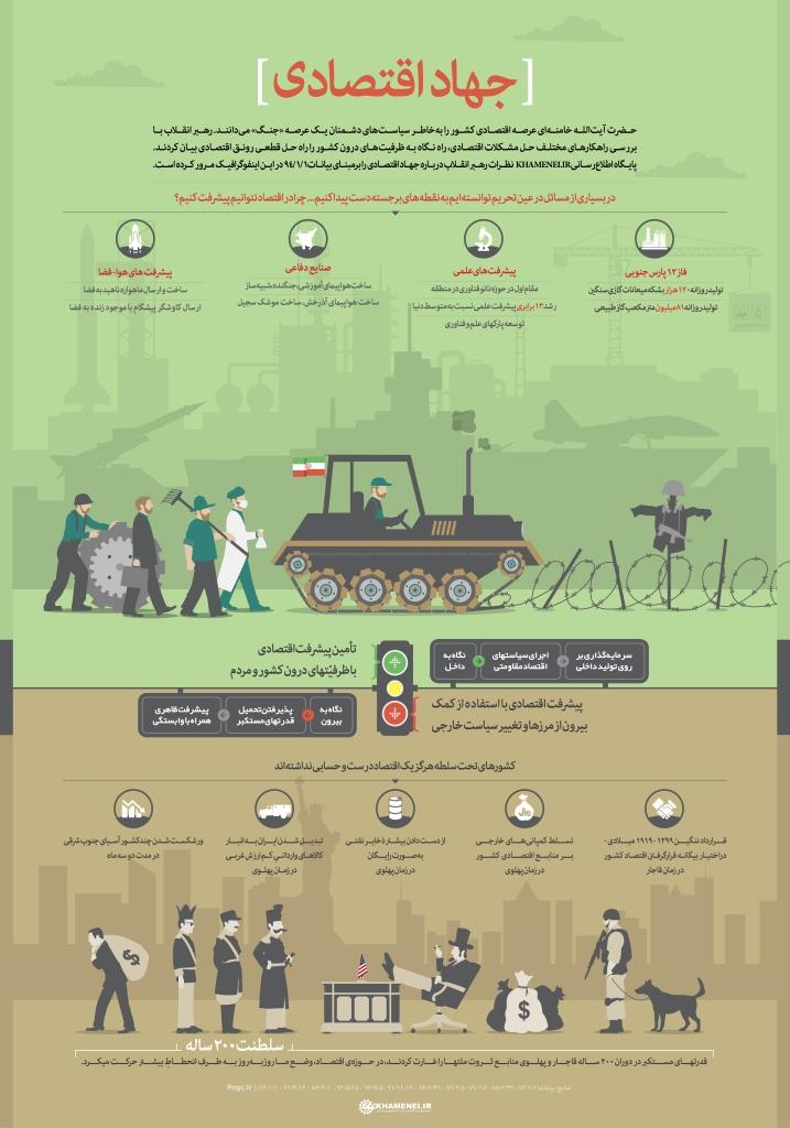 حضرت آیتالله خامنهای عرصه اقتصادی کشور را بهخاطر سیاستهای دشمنان یک عرصه «جنگ» میدانند. رهبر انقلاب با بررسی راهکارهای مختلف حل مشکلات اقتصادی، راه نگاه به ظرفیتهای درون کشور را راهحل قطعی رونق اقتصادی بیان کردند. پایگاه اطلاعرسانی KHAMENEI.IR نظرات رهبر انقلاب درباره جهاد اقتصادی را برمبنای بیانات ۹۴/۱/۱ در این اینفوگرافیک مرور کرده است.