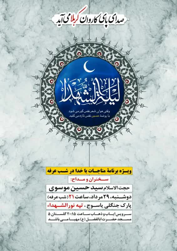 این برنامه همزمان با شب عرفه با سخنرانی و مداحی حجت الاسلام سید حسین موسوی دوشنبه 29 مردادماه از ساعت 21 آغاز می گردد.
