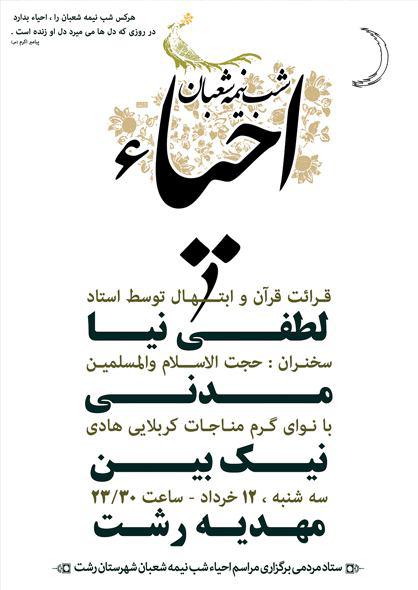 به گزارش سرویس استانهای حلقه وصل، مراسم احیای نیمه شعبان به همت ستاد مردمی احیاء نیمه شعبان همراه با قرائت قرآن شامگاه 12 خردادماه از ساعت 23:30 در مهدیه رشت برگزار می شود.