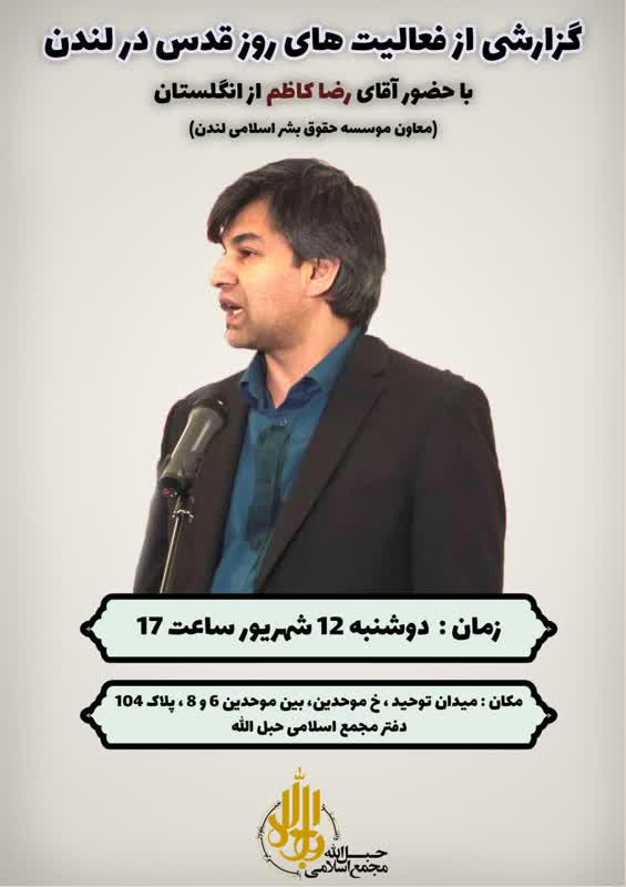 در این نشست گزارشی از فعالیت های روز قدس در لندن توسط رضا کاظم معاون مؤسسه حقوق بشر اسلامی لندن از انگلستان ارائه می گردد.