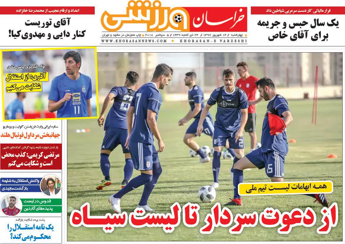 تیتر نیم صفحه نخست روزنامههای ورزشی چهارشنبه ۱۴ شهریور ۹۷ به مسائل مهم روز ورزش از جمله فوتبال پرداخته است.