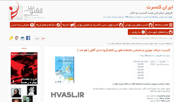 سرویس حاشیهنگاری: در پی اعتراض پایگاه خبری - تحلیلی حلقه وصل، به انتشار خبری در مورد برگزاری کنسرت حركات موزون و نمايشي عاشقانههاي بيكلام گروه نداي آفاق که قرار بود امروز در ساعت سه در تالار وحدت تهران برگزار شود، سایت ایران کنسرت در خبری اعلام کرد که این کنسرت لغو شده است.