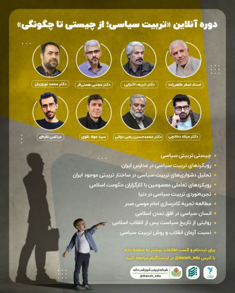 به گزارش حلقه وصل؛ شبکه تربیتی آموزشی دانه با همکاری چند مجموعه فرهنگی دیگر اقدام به برگزاری دوره «تربیت سیاسی؛ از چیستی تا چگونگی»ویژه معلمان، مربیان و فعالان فرهنگی تربیتی مینماید.