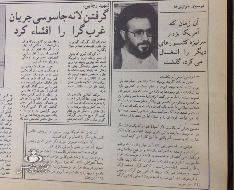 یکی از افراد شاخص این جریان حجتالاسلام سیدمحمد موسوی خوئینیهاست. او که نقش به سزایی در فتح لانه جاسوسی داشت، در دهه هفتاد از رهبران فکری جریان اصلاحطلبی شد. در ذیل بریدهای از روزنامه اطلاعات مورخ 1360/8/13 مشاهده میکنید که به بازخوانی موضع حجتالاسلام خوئینیها پرداخته است. در آنسالها خوئینیها آمریکا را دشمن همیشگی ملت ایران قلمداد میکرد و رابطه ایران و آمریکا را رابطه گرگ و میش میدانست و معتقد بود: «آن زمان که آمریکا بزور سرنیزه کشورهای دیگر را اشغال میکرد، گذشت»