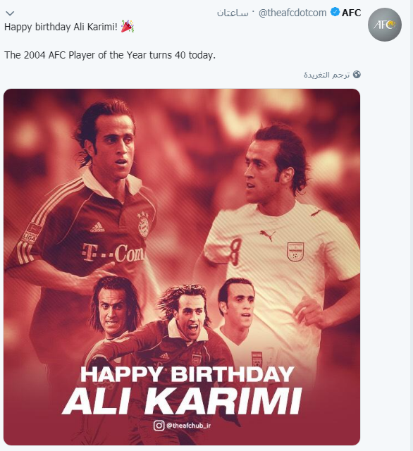 به گزارش حلقه وصل، کنفدراسیون فوتبال آسیا با انتشار عکسی از علی کریمی، کاپیتان سابق تیم ملی کشورمان تولد 40 سالگی او را تبریک گفت.