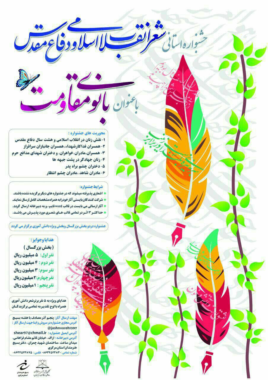 به گزارش سرویس استان های حلقه وصل، در راستای تبیین نقش زنان در انقلاب و دفاع مقدس جشنواره استانی شعر انقلاب اسلامی و دفاع مقدس با عنوان «بانوی مقاومت» به همت سازمان بسیج هنرمندان استان مرکزی برگزار میشود.