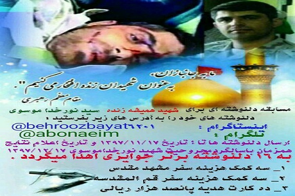 به گزارش سرویس استان های حلقه وصل، بهمناسبت شهادت شهید سید نورخداموسوی مسابقه «دلنوشتهای برای شهید همیشه زنده» سیدنورخدا موسوی برگزار میشود.