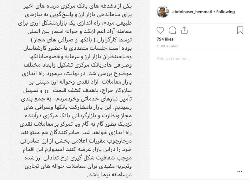 در اینستاگرام درباره راه اندازی بازار متشکل ارزی نوشت: