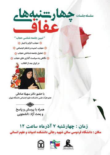 این هفته جلسه ی «چهارشنبه های عفاف» با حضور استاد سهیلا صادقی عضو هیأت علمی دانشکده علوم اجتماعی دانشگاه تهران برگزار می شود.