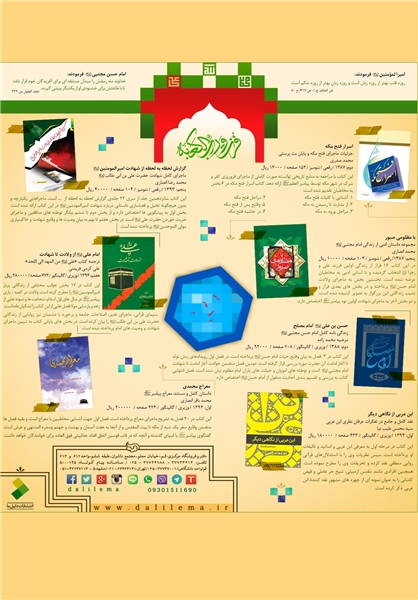 در این اینفوگرافی کتابهای اسرار فتح مکه، گزارش لحظه به لحظه از شهادت امیرالمومنین(ع)، با مظلومی صبور(داستانهای ادبی درباره زندگی امام حسن(ع))، امام علی(ع) از ولادت تا شهادت، حسن بن علی(ع) امام مصلح، معراج محمدی و ابن عربی از نگاه دیگر معرفی شده است.