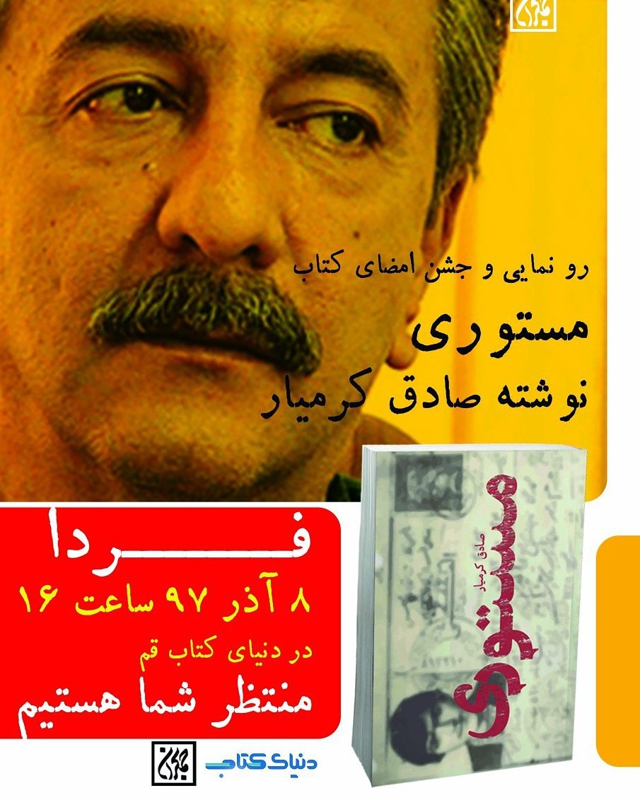 این مراسم با حضور صادق کرمیار نویسنده اثر از ساعت 16 در دنیای کتاب قم واقع در خیابان صفاییه به همت انتشارات کتاب جمکران برگزار می گردد.