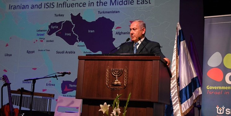 نخستوزیر رژیم صهیونیستی با نشان دادن تصویری از نقشه غرب آسیا با رنگهای سیاه به نشانه نفوذ ایران و قرمز به نشانه حضور گروه تروریستی داعش، مدعی شد: «ایران میخواهد ارتش خود را از فاصله 1500 کیلومتری به مرزهای ما بیاورد، موشکهایی با برد 400 تا 700 کیلومتر را بیاورد که میتواند تمام اسرائیل را پوشش دهد و همچنین 80 هزار مبارز شیعه را که قصد نابودی ما را دارند».