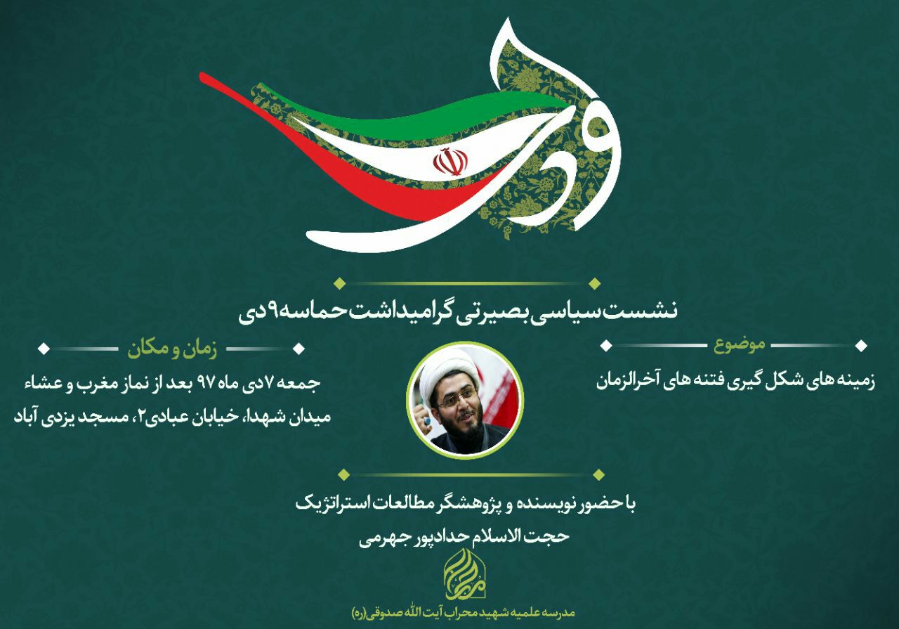 این نشست با موضوع علل وزمینه های شکل گیری فتنه های آخرالزمان در مسجد یزدی آباد برگزار می گردد.