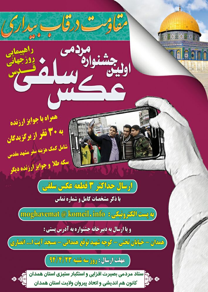 به گزارش سرویس استانهای حلقه وصل، به همت کانون هماندیشی و اتحاد پیروان ولایت و ستاد مردمی استکبارستیزی همدان، اولین جشنواره مردمی عکس سلفی در روز قدس با عنوان مقاومت در قاب بیداری برگزار میشود.