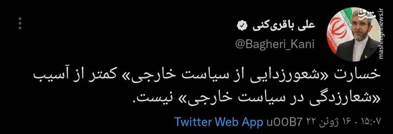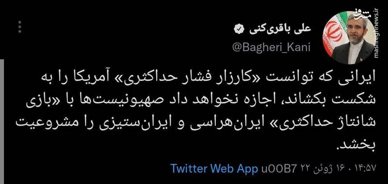 به گزارش حلقه وصل، دکتر علی باقری کنی طی توییتی نوشت: ایرانی که توانست «کارزار فشار حداکثری» آمریکا را به شکست بکشاند، اجازه نخواهد داد صهیونیستها با «بازی شانتاژ حداکثری» ایرانهراسی و ایرانستیزی را مشروعیت بخشد.