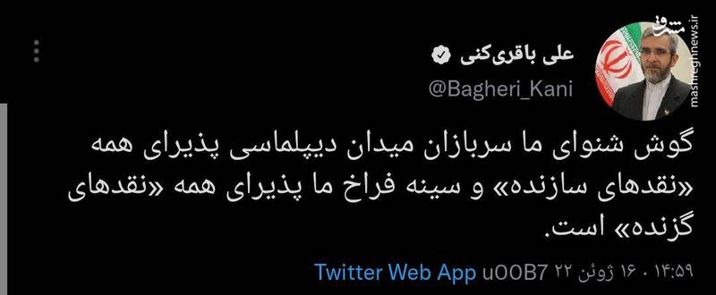 گوش شنوای ما سربازان میدان دیپلماسی پذیرای همه «نقدهای سازنده» و سینه فراخ ما پذیرای همه «نقدهای گزنده» است.