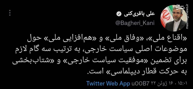 «اقناع ملی»، «وفاق ملی» و «همافزایی ملی» حول موضوعات اصلی سیاست خارجی، به ترتیب سه گام لازم برای تضمین «موفقیت سیاست خارجی» و «شتاببخشی به حرکت قطار دیپلماسی» است.