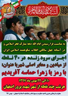 این برنامه شامل اجرای سرود زنده در 40 نقطه از میادین و معابر شهر اصفهان است که با شعار «با رمز یا زهرا حماسه آفریدیم» صورت می گیرد.
