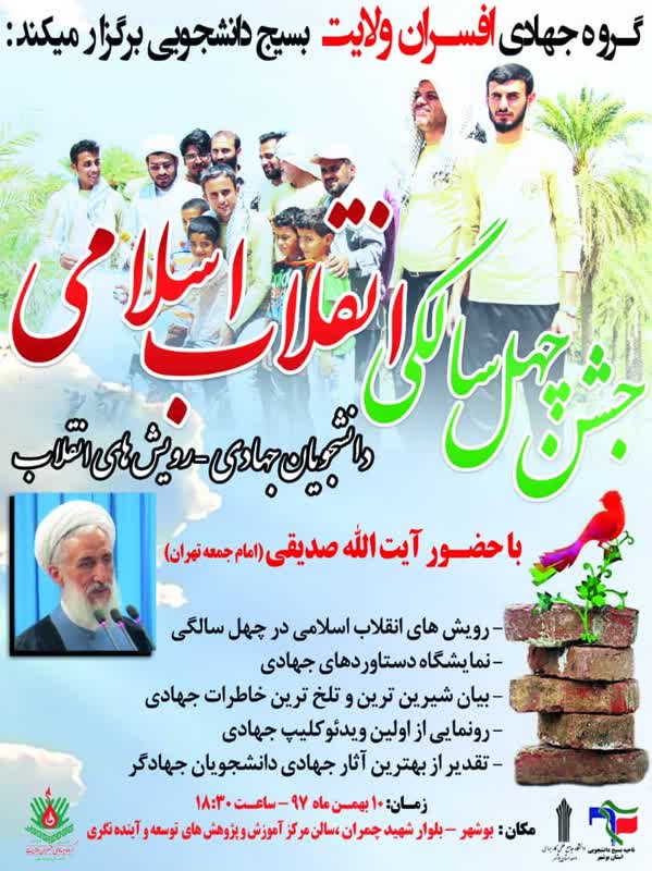 به گزارش سرویس استان های حلقه وصل، به مناسبت سالروز پیروزی انقلاب اسلامی گروه جهادی «افسران ولایت» استان بوشهر نخستین گردهمایی دانشجویان جهادگر را برگزار می کند.