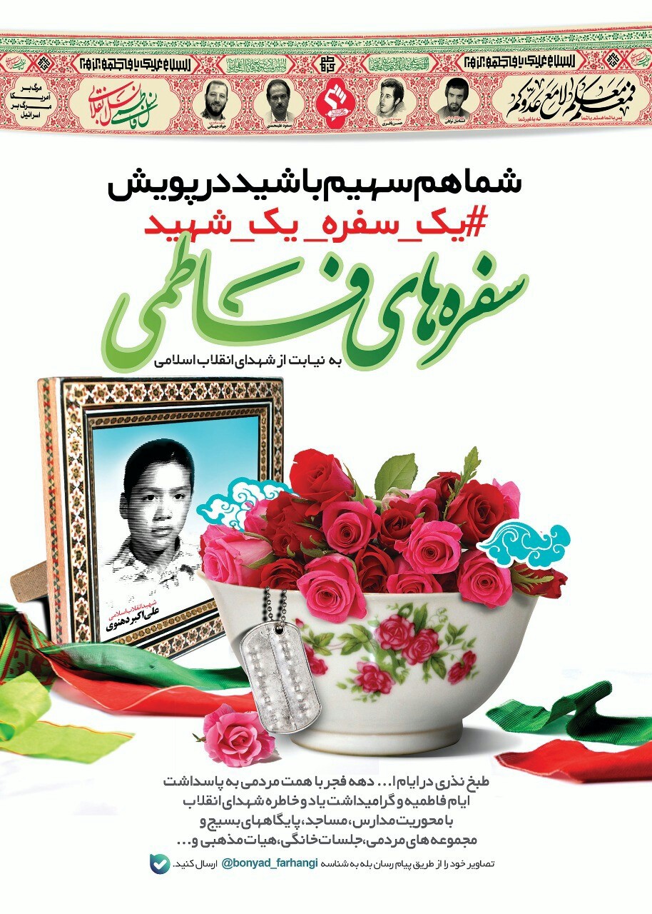 به گزارش سرویس استان های حلقه وصل، پویش «سفرههای فاطمی» با هشتک#یک_سفره_یک_شهید به نیابت از شهدای انقلاب اسلامی به همت بنیاد فرهنگی رضوی راهاندازی شده است.