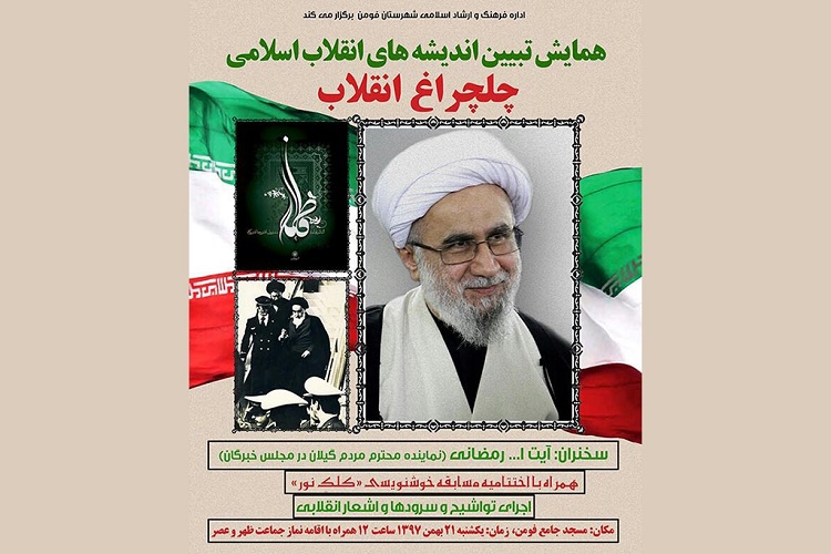 گفتنی ست، این همایش «چلچراغ انقلاب» با همکاری دفتر امام جمعه فومن، کانون فرهنگی و هنری ثلقین مسجد جامع، سپاه ناحیه فومن، ستاد بزرگداشت دهه مبارک فجر و با حضور مردم فهیم و شهیدپرور این شهرستان برگزار خواهد شد.