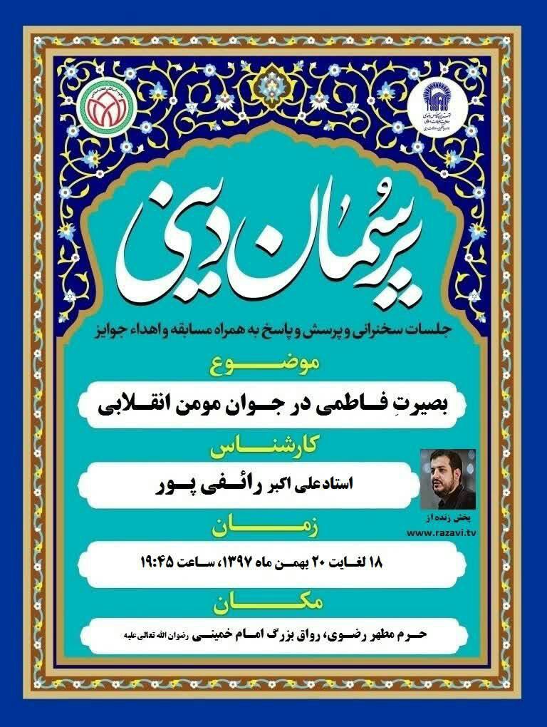 در این برنامه که به مدت سه شب در رواق امام خمینی(ره) حرم مطهر رضوی برگزار می شود استاد رائفی پور سخنرانی می کنند.