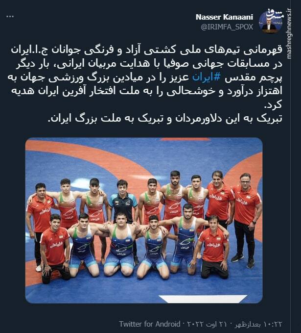 به گزارش حلقه وصل، ناصر کنعانی روز یکشنبه در توئیتی نوشت: «قهرمانی تیمهای ملی کشتی آزاد و فرنگی جوانان جمهوری اسلامی ایران در مسابقات جهانی صوفیا با هدایت مربیان ایرانی، بار دیگر پرچم مقدس ایران عزیز را در میادین بزرگ ورزشی جهان به اهتزاز درآورد و خوشحالی را به ملت افتخار آفرین ایران هدیه کرد. تبریک به این دلاورمردان و تبریک به ملت بزرگ ایران.»