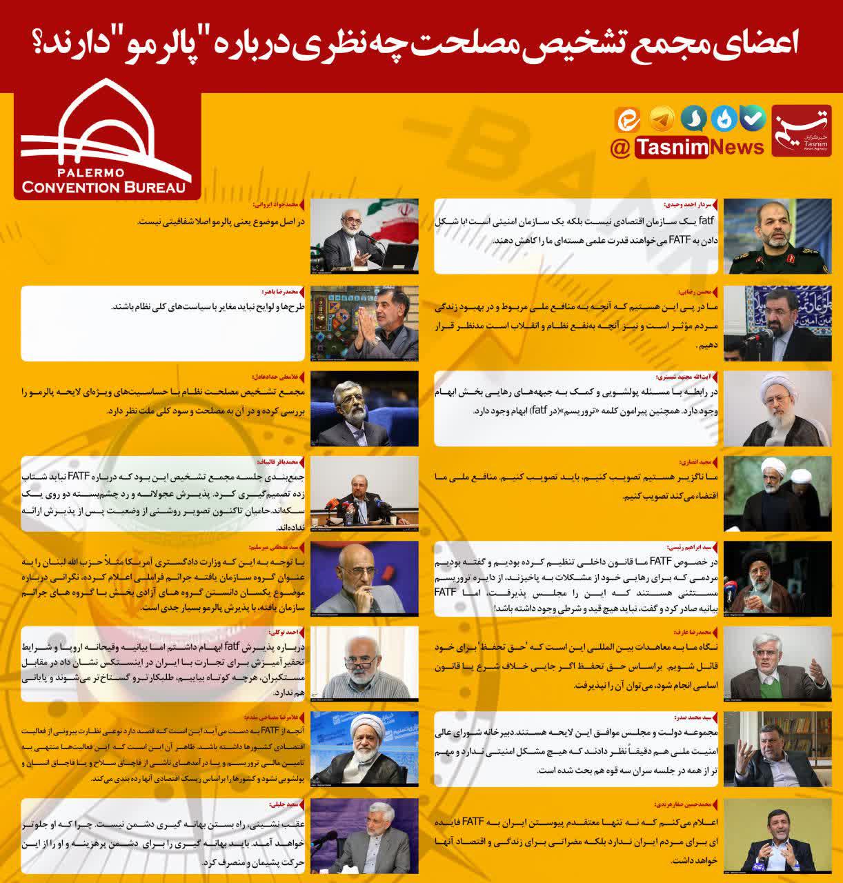 در طول چند هفته اخیر، اعضای مجمع تشخیص هرکدام مواضع مخالف و موافقی در ارتباط با لوایح مرتبط با fatf اتخاذ کردند که بنظر میرسد اکثریت اعضای نظر موافقی در این باره ندارند. در جلسه گذشته مجمع نظرات کمیسیون حقوقی و کمیسیون دفاعی مجمع در مخالفت با تصویب پالرمو بود.
