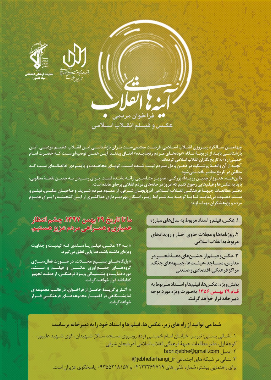 در همین راستا دفتر مطالعات جبهه فرهنگی استان آذربایجان شرقی با انتشار فراخوان «آینه های انقلاب» از عموم مردم، صاحبان عکس، فیلم و سند از انقلاب اسلامی به ویژه قیام 29 بهمن 56 دعوت کرد تا امکان بهره برداری حداکثری از این گنجینه ها را برای عموم مردم و پژوهشگران مهیا سازند.