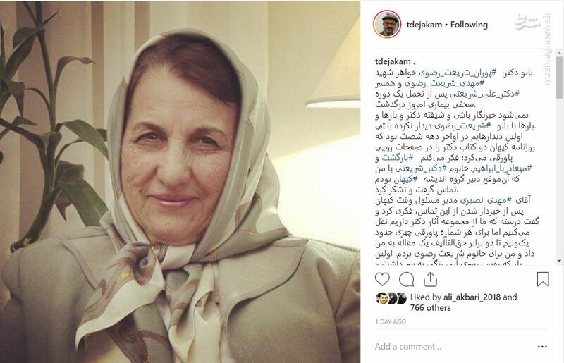 آقای مهدی نصیری مدیر مسئول وقت کیهان پس از خبردار شدن از این تماس، فکری کرد و گفت درسته که ما از مجموعه آثار دکتر داریم نقل میکنیم اما برای هر شماره پاورقی چیزی حدود یکونیم تا دو برابر حقالتألیف یک مقاله به من داد و من برای خانوم شریعت رضوی بردم. اولین بار که رفتم روسری آبی رنگی به سر داشت و داشت توی حیاط منزل جمالزاده شمالی گلهای باغچه را آب میداد؛ منزلی که بعدها موزه دکتر شریعتی شد. جالب اینکه بارهای بعدی هم همیشه توی حیاط داشت به گلها آب میداد و من اگرچه بارها ایشون را در جاهای مختلف دیگر دیدم، اما همیشه تصویرم از او خانومی روسری بهسر در حال آب دادن به گلهاست. کاش تهران بودم و در مراسم تشییع و ترحیم این همسر و خواهر شهید شرکت میکردم.