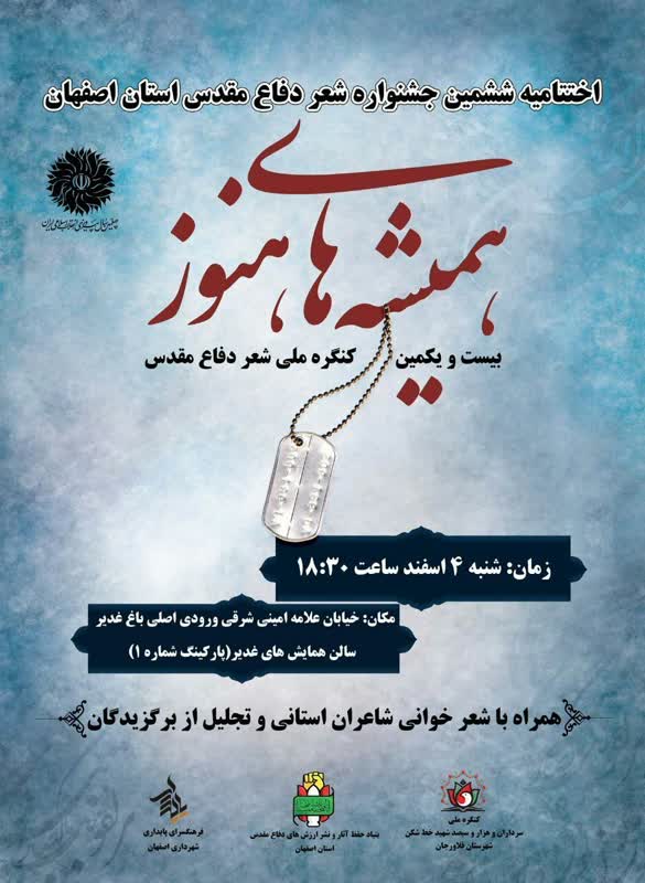 به گزارش سرویس استان های حلقه وصل، در آستانه ۴۰ سالگی انقلاب اسلامی به منظور انعکاس و انتقال میراث گرانسنگ دفاع مقدس، ششمین جشنواره استانی شعر دفاع مقدس استان اصفهان با عنوان «همیشههای هنوز» برگزار و آیین اختتامیه جشنواره عصر امروز همراه با شعرخوانی شاعران استانی برگزار می گردد.