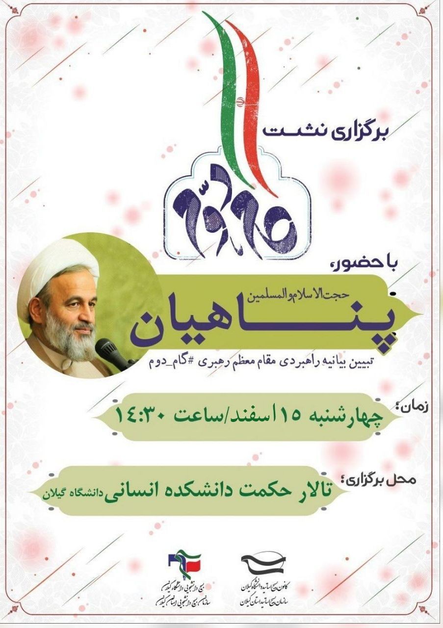 به گزارش سرویس استان های حلقه وصل، در پی انتشار بیانیه ی «گام دوم انقلاب» از سوی مقام معظم رهبری به مناسبت چهل سالگی انقلاب اسلامی نشستی به همت بسیج اساتید دانشگاه گیلان و بسیج دانشگاهی استان برگزار می شود.