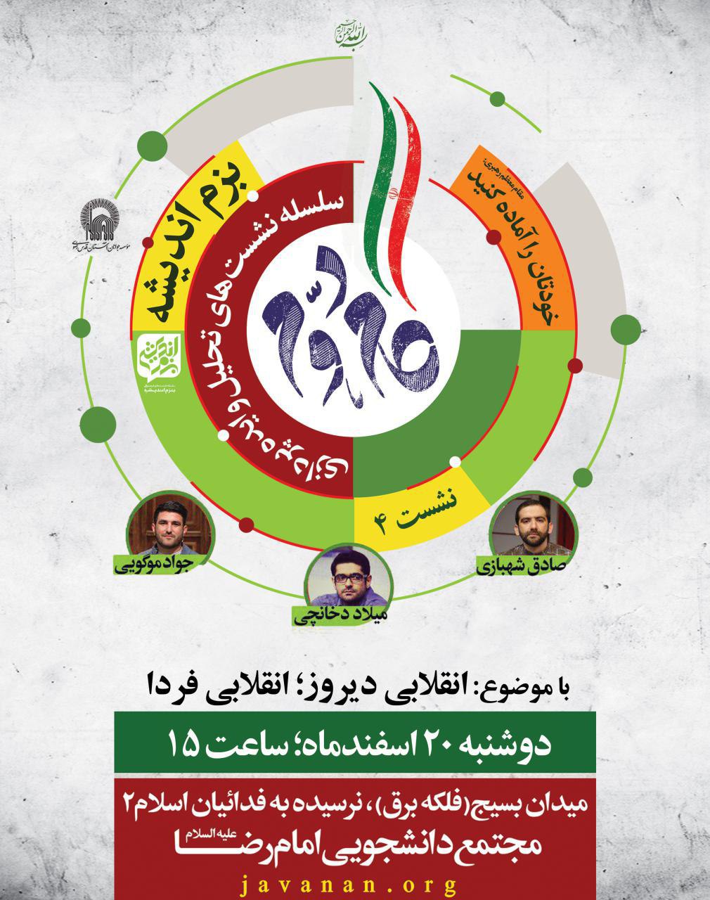 گفتنی ست،چهارمین نشست نیز عصر امروز دوشنبه 20 اسفندماه با حضور میلاد دخانچی، جوادموگویی و صادق شهبازی از ساعت١۵ در مجتمع دانشجویی امام رضا(ع) واقع در میدان بسیج برگزار می گردد.