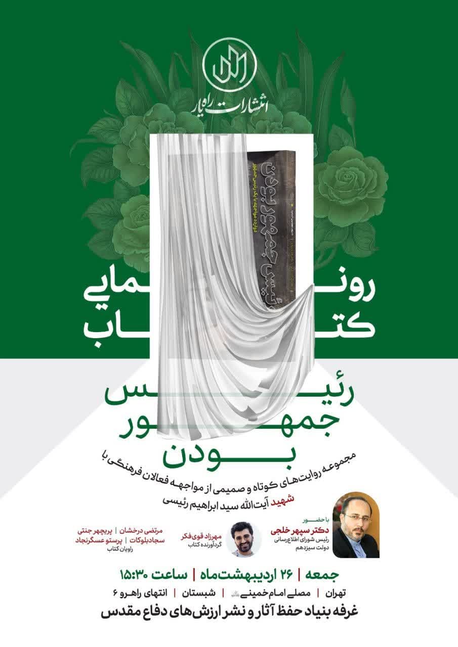 مجموعه روایتهای کوتاه و صمیمی از مواجهه فعالان فرهنگی با شهید آیت الله سید ابراهیم رئیسی از انتشارات راهیار باحضور دکتر سپهر خلجی رئیس شورای اطلاعرسانی دولت سیزدهم، مهرزاد قوی فکر (گردآورنده کتاب) و مرتضی درخشان، پریچهر جنتی، سجادبلوکات، پرستو علیعسگرنجاد از راویان کتاب جمعه ۲۶ اردیبهشتماه ساعت 15:30در نمایشگاه بینالمللی کتاب تهران انتهای راهرو ۶ غرفه بنیاد حفظ آثار و نشر ارزشهای دفاع مقدس برگزار میشود.