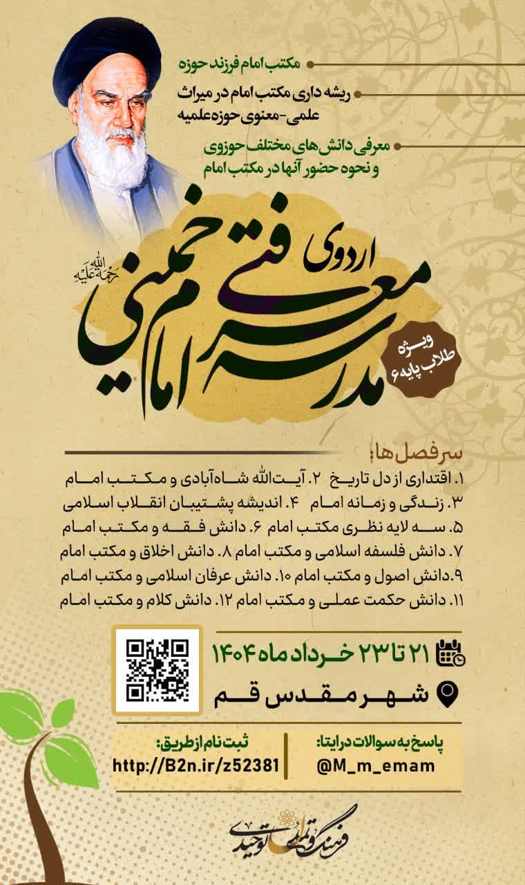 مؤسسه فرهنگ و تمدن توحیدی (فتوت) نهمین دورۀ اردوی علمی مدرسه معرفتی امام خمینی (ره) با هدف تبیین ریشههای مکتب امام در میراث علمی ــ معنوی حوزه علمیه و معرفی دانشهای مختلف حوزوی و نحوه حضور آنها در مکتب امام ویژه طلاب ورودی پایه 6 از ۲۱ الی ۲۳ خرداد ۱۴۰۴ در شهر مقدس قم برگزار میکند.