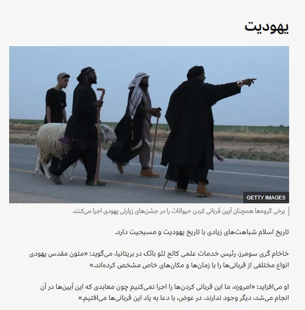 بیبیسی میگوید که در مسیحیت و یهودیت، قربانیکردن منسوخ شده و دیگر صورت نمیگیرد؛ اما در دین اسلام، این رسم همچنان باقی است. با خواندن گزارش بیبیسی فارسی، اینطور برداشت میشود که این رسانه با ارائه تصویری ناراحتکننده از قربانی گوسفندان، سعی دارد تصویری خشونتآمیز از اسلام و مسلمانان ترسیم کند.