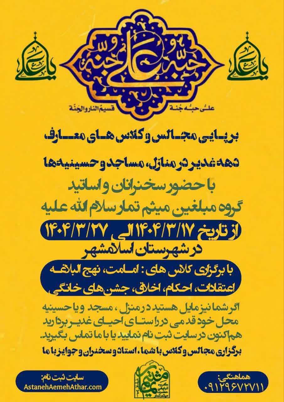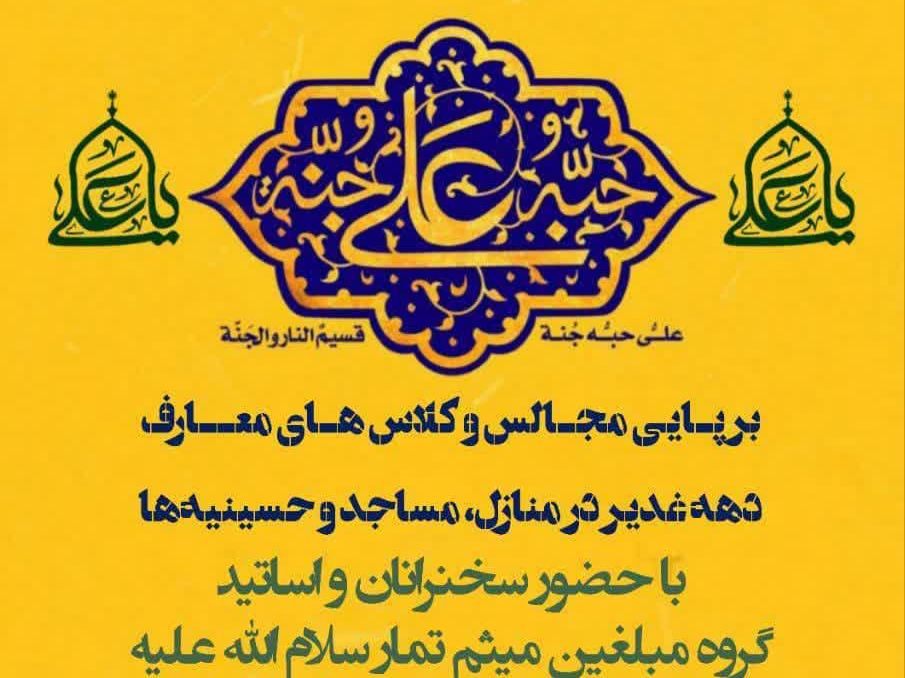 برگزاری دورههای امامت نهج البلاغه اعتقادات احکام اخلاق برپایی مجالس و دورههای معارفِ غدیر در منازل مساجد حسینیهها و مراکز جمعیتی با حضور سخنرانان و اساتید گروه مبلغین میثم تمار سلاماللهعلیه از شنبه ۱۷ تا سهشنبه ۲۷ خرداد ماه ۱۴۰۴ میباشد.