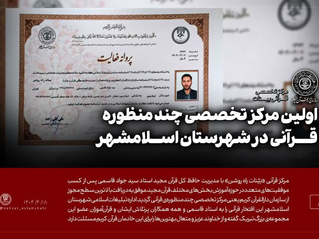 مرکز قرآنی بیّنات موفق به اخذ بالاترین سطح مجوز در میان مراکز قرآنی کشور و دریافت مجوز اولین مرکز تخصصی چند منظوره قرآنی در شهرستان اسلامشهر شد.