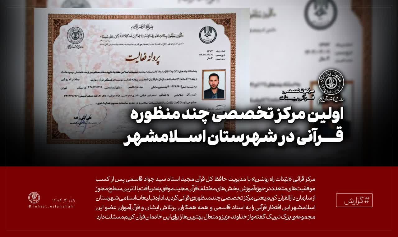مرکز قرآنی بیّنات راه روشن با مدیریت حافظ کل قرآن مجید استاد سید جواد قاسمی پس از کسب موفقیتهای متعدد در حوزه آموزش بخشهای مختلف قرآن مجید موفق به دریافت بالاترین سطح مجوز از سازمان دارالقرآن کریم یعنی مرکز تخصصی چند منظورهی قرآنی گردید.