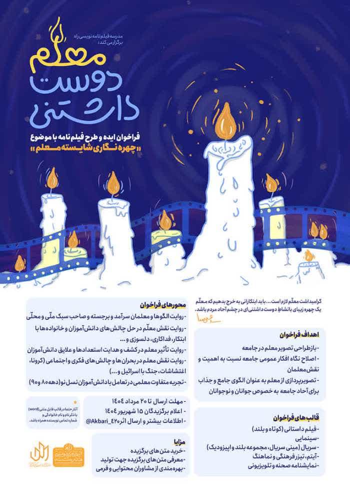 این فراخوان با موضوع چهرهنگاری شایسته معلم با محورهای الگوها و معلمان سرآمد و صاحب سبک ملّی و محلّی، نقش معلّم در حل چالشهای دانشآموزان و خانوادهها با ابتکار، فداکاری، دلسوزی، تأثیر معلم در کشف و هدایت استعدادها و علایق دانشآموزان، نقش معلم در بحرانها و چالشهای فکری و اجتماعی (کرونا، اغتشاشات، جنگ با اسرائیل و ..) و تجربه متفاوت معلمی در ده سال اخیر در قالب فیلمنامه داستانی (کوتاه و بلند)، سینمایی، سریال (مینی سریال، مجموعه بلند و اپیزودیک)، آیتم، تیزر فرهنگی و نماهنگ و نمایشنامه صحنه و تلویزیونی میباشد.