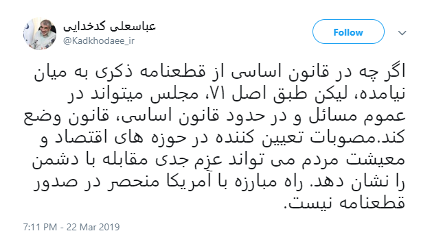 کدخدایی در واکنش به اظهار نظر یکی از نمایندگان مجلس در رابطه با رد طرح مجلس برای تصویب قطعنامه توسط شورای نگهبان، در توییتر خود نوشت: