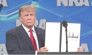 ترامپ، در جمع هزاران نفر از اعضای لابی انجمن ملی اسلحه، در شرایطی که کلاه قرمزش را پوشیده بود گفت: «امضایمان را پس میگیریم.»
