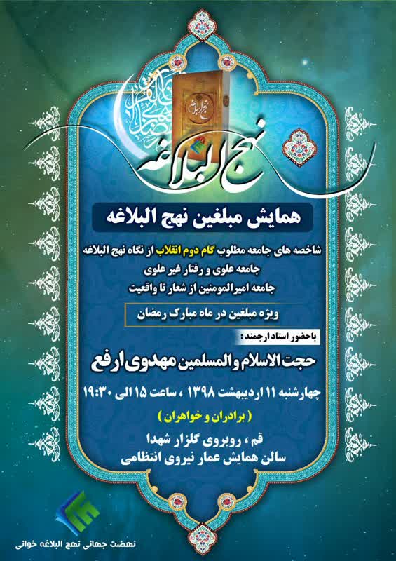 این همایش و کارگاه تخصصی به همت نهضت جهانی نهج البلاغه خوانی با حضور حجت الاسلام مهدوی ارفع برگزار می گردد.