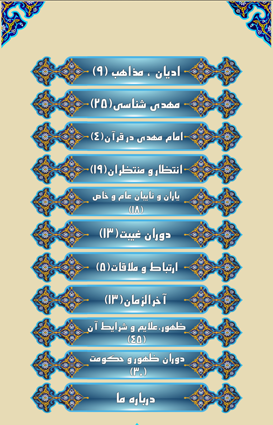 پرسشهای نرمافزار موبایل «پرسمان مهدویت» در 10 فصل ادیان و مذاهب، مهدیشناسی، امام زمان(عج) در قرآن، انتظار و منتظران، یاران و نایبان عام و خاص، دوران غیبت، ارتباط و ملاقات، آخرالزمان، ظهور، علائم، شرایط و دوران ظهور و حکومت جهانی قرار داده شده است.